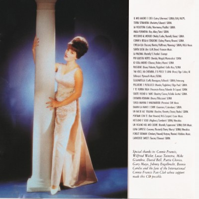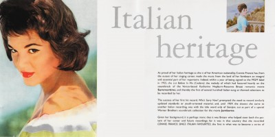 As proud of her Italian heritage as she is of her American nationality, Connie Francis has, from the outset of her singing career, made the music from the land of her forebears an integral and essential part of her repertoire. Indeed, within a year of being signed to the MGM label in 1955, she cut Believe In Me (Credemi), the melody of which had featured heavily on the soundtrack of the Venice-based Katharine Hepburn-Rosanno Brazzi romantic movie Summertime, and thereby the first of several hundred Italian-sung or themed selections to be recorded by her.