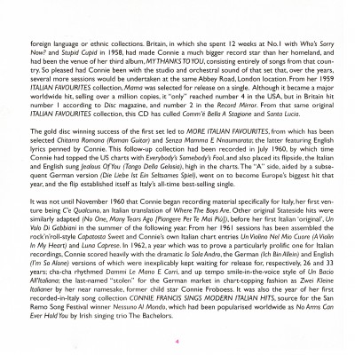 It was not until November 1960 that Connie began recording material specifically for Italy, her first venture being C'e Qualcuno, an Italian translation of Where The Boys Are. Other original Stateside hits were similarly adapted (No One, Many Tears Ago [Piangere Per Te Mai Più]), before her first Italian `original' , Un Volo Di Gabbiani in the summer of the following year. From her 1961 sessions has been assembled the rock’n’roll-style Capatosta Sweet and Connie’s own Italian chart entries Un Violino Nel Mio Cuore (A Violin In My Heart) and Luna Caprese.