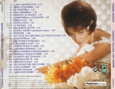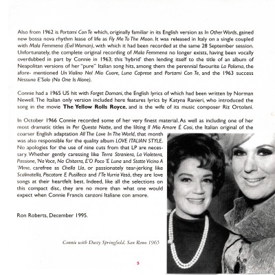 In October 1966 Connie recorded some of her very finest material. As well as including one of her most dramatic titles in Per Questa Notte, and the lilting Il Mio Amore Cosi, the Italian original of the coarser English adaptation All The Love In The World, that month was also responsible for the quality album LOVE ITALIAN STYLE. No apologies for the use of nine cuts from that LP are necessary. Whether gently caressing like Terra Straniera, La Violetera, Passione, ‘Na Voce, Na Chitarra, E’O Poco ‘E Luna and Statte Vicino A ‘Mme, carefree as Chella Lla, or passionately tear-jerking like Scalinatella, Piscatore E Pusilleco and I’Te Vurria Vasa, they are love songs at their heartfelt best. Indeed, like all the selections on this compact disc, they are no more than what one would expect when Connie Francis canzoni Italiane con amore.