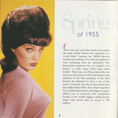 Forty years ago, and when barely in her teens, the name Connie Francis first appeared on a record label. Landing her MGM Records contract had nothing to do with the impressive voice emanating from the diminutive New Jersey-born songstress but, in Connie's own words, "a really `dippy' little song called Freddy." That song, one of four demo titles she had cut in the spring of 1955, had attracted the attention of the then president of the label because he happened to have a son of that name. It became the first of 10 consecutive flop singles before Who's Sorry Now? catapulted her to international fame and began an unparalleled run of successes that established Connie as the world's biggest selling female singer and with record sales in excess of 300 million.
