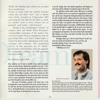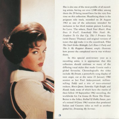 In this special anniversary year as a recording artist, it is appropriate that this collection should embrace as many of the differing vocal styles that made Connie such a global favourite. Chronologically, the titles include My Dream, a powerfully sung display of teen angst, cut at the same 25 January 1960 session as her Paul Anka-penned, million-selling Teddy, and a trio of teen-oriented rockers, Movie Queen, Saturday Night Knight, and Handy Andy, which, though fun, do not have the merits of their fellow 18 September 1962 recording, the worldwide hit I'm Gonna Be Warm This Winter. Better is the folksy Ballad Of Bobby Dawn, part of a mixed 10 June 1963 session that produced Italian and Country titles as well as another global success, Drowning My Sorrows.