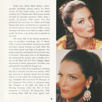 The latter half of the Sixties produced a crop of excellent recordings. On 15 March 1966, a session from which, until now, no tracks had been issued, Connie cut both When You Come Home Again and Edge Of Forgiveness; the former, in typical heartfelt style, aimed at sweethearts of loved ones sent to Vietnam. That same year, on 24 September, she produced the quality odes to broken love, Part Of The Wind and It'll Never Happen Again, the second of which, composed by Tim Hardin, was subsequently recorded by Peggy Lee.