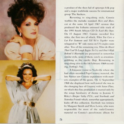 A frequent visitor to Nashville where she had often recorded pop-Country material, the late Sixties saw Connie experiment with modern examples of the genre. On 12 September 1968 she displayed how well-suited she was to the changing face of Country with Satan Place, a fine production marred only by the song's familiarity of theme to Jeannie C Riley's Harper Valley P.T.A., and Yearbooks and Yesterdays Friends which, somewhat appropriately, provides the opening selection. Yearbooks was written by Myra Smith and Margaret Lewis, who were responsible for most of the rock-Country material on Connie's penultimate album for MGM, The Wedding Cake, which was recorded three months later. Clearly at home with the modern Country sound, this set's final `new' item is Reuben James which, recorded on 8 September 1969 and among her last titles for the label is, surely, yet another track to have missed out on potential - and worthy - chart honours?