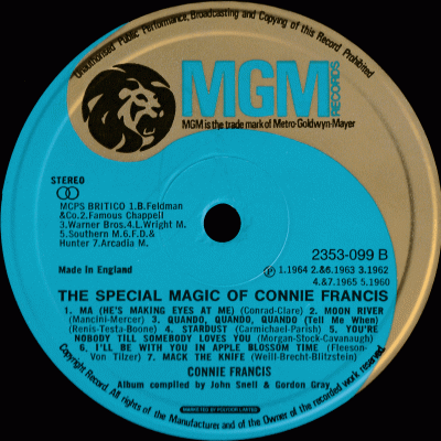 In marked contrast is the knowing "You're Nobody Till' Somebody Loves You" presented in shuffle rhythm, while two of the U.S.A’s most romantic evergreens "Anniversary Waltz" and "Apple Blossom Time" are handled in warm, caressing tones. In wistful manner Connie performs the Oscar-winning "Moon River" and the Hoagy Carmichael classic "Stardust; seemingly oblivious to the fact that the latter is one of the world's most oft-recorded items: such is the freshness of her interpretation. From the same session comes the German-sung opening "Mack the Knife" and the late Edith Piaf’s French success "Milord!”