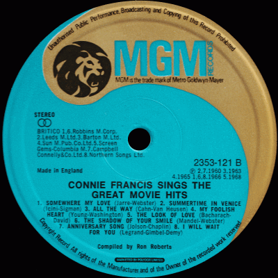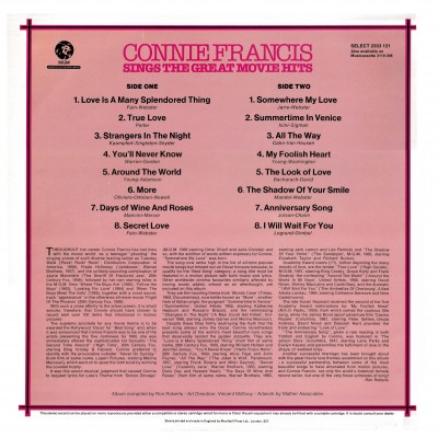 Another successful marriage has been brought about with the great movie love themes assembled on this album - a successful partnership between some of the most beautiful songs to have emanated from motion pictures, and Connie Francis not only the world's foremost female record seller, but one of the very finest actresses of song!