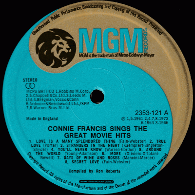 They are the haunting theme from 'Mondo Cane' (Times, 1963, Documentary), now better known as "More"; another item of Italian origin, the poignant "Summertime In Venice" ('Summertime', United Artists 1955, starring Katherine Hepburn and Rossano Brazzi), and the reminiscing "Strangers In The Night" ('A Man Could Get Killed', Universal 1966, starring James Garner and Melina Mercouri) Despite these titles firmly destroying the myth that the best song always wins the Oscar, Connie nevertheless presents some of the world's most beautiful love songs that deservedly landed the golden statuette They are, "Love Is A Many Splendored Thing" (from film of same name, 20th Century Fox, 1955, starring William Holden and Jennifer Jones), "You'll Never Know" ('Hello Frisco Hello', 20th Century Fox, 1943, starring Alice Faye and John Payne), "All The Way" ('The Joker Is Wild', Paramount, 1957, starring Frank Sinatra and Mitzi Gaynor), "Secret Love" ('Calamity Jane', Warner Brothers, 1953, starring Doris Day and Howard Keel); "The Days Of Wine And Roses" (from film of same name, Warner Brothers, 1963, starring Jack Lemon and Lee Remick) and "The Shadow Of Your Smile" ('The Sandpiper', M-G-M, 1965, starring Elizabeth Taylor and Richard Burton)