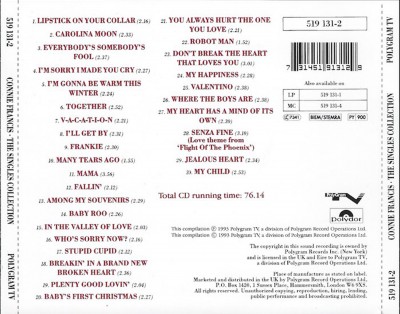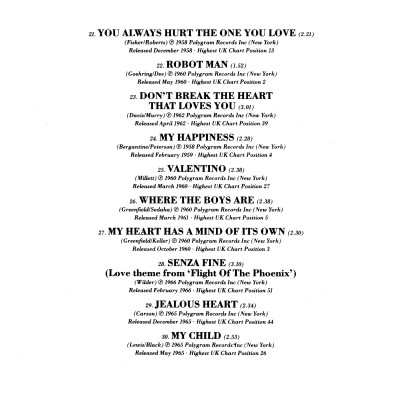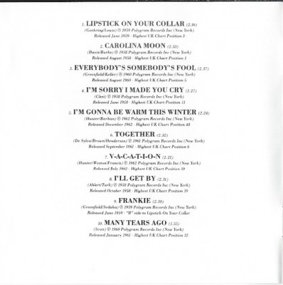 No singles collection could be considered complete without the rock'n'roll classic Lipstick On Your Collar, other million sellers like Among My Souvenirs, My Happiness, Frankie, Breakin' In A Brand New Broken Heart, Don't Break The Heart That Loves You and Many Tears Ago or the self-penned Plenty Good Lovin' and V-A-C-A-T-I-O-N. To these have been added the seasonal Baby's First Christmas and other UK hits Valentino, Robot Man and I'm Gonna Be Warm This Winter.