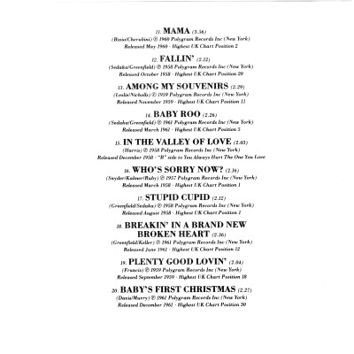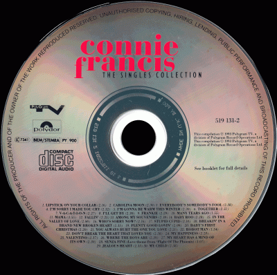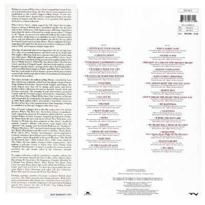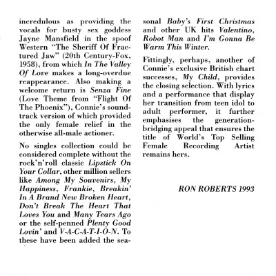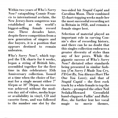 Selection of material played an important role in carving Connie' s slice of recording history, and there can be no doubt that this singles collection embraces a greater diversity of styles than any of her peers. While the gigantic success of Who's Sorry Now? dictated other standards being presented in similar fashion (I'm Sorry I Made You Cry, I'll Get By, YouAlways Hurt The One You Love); and that of Stupid Cupid - the first rock track by a white female to top the charts - prompted the other Neil Sedaka/Howard Greenfield hand-clappers Fallin' and Baby Boo, she further lent her vocal magic to movie themes, pioneered the pop-country sound of the Sixties and placed titles of unashamed sentimentality into the best-sellers.