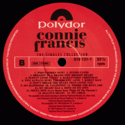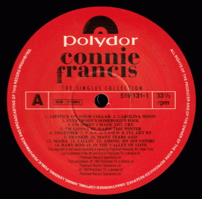Within two years of Who's Sorry Now? catapulting Connie Francis to international acclaim, the New Jersey-born songstress was established as the world's biggest-selling female record star. Three decades later, despite fierce competition from a new generation of singers and disc buyers, it is a position that appears destined to remain unbeaten.