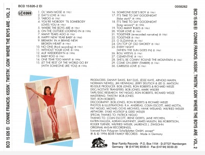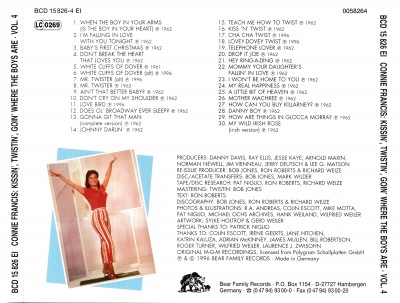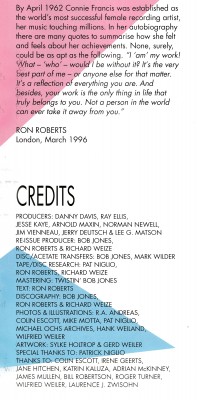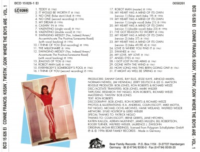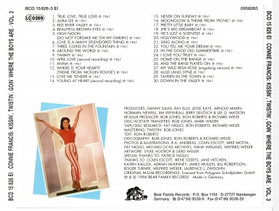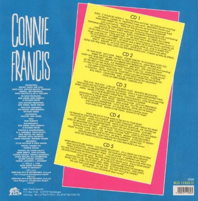 Unlike Bear Family's first CD collection of Connie's English language recordings (BCD 15616 EI `White Sox, Pink Lipstick...and Stupid Cupid’) which embraced her entire Fifties repertoire, this follow-up package, containing a similar number of performances, “merely” covers the period January 1960 to April 1962, so prolific had been her output. It opens with selections recorded on January 25, 1960 at Radio Recorders, Hollywood; one of two sessions undertaken by Connie during “free” afternoons while appearing at the prestigious Cloisters nightspot. The first of these was Teddy, written for her by fellow international hitmaker Paul Anka as a tribute to her friend, former Three Chuckles member Teddy Randazzo.