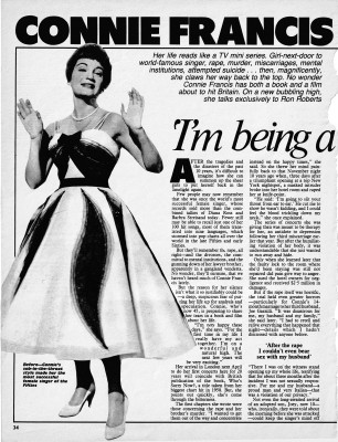 Her life reads like a TV mini series. Girl-next-door to world-famous singer, rape, murder, miscarriages, mental institutions, attempted suicide . . . then, magnificently, she claws her way back to the top. No wonder Connie Francis has both a book and a film about to hit Britain. On a new bubbling high, she talks exclusively to Ron Roberts